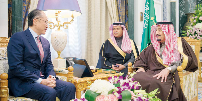 استقبل خادم الحرمين الشريفين الملك سلمان بن عبدالعزيز آل سعود -حفظه الله- في مكتبه بقصر اليمامة أمس، رئيس مجموعة البنك الدولي جيم كيم، والوفد المرافق له.
