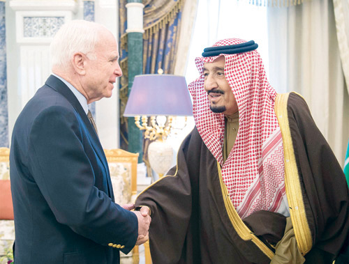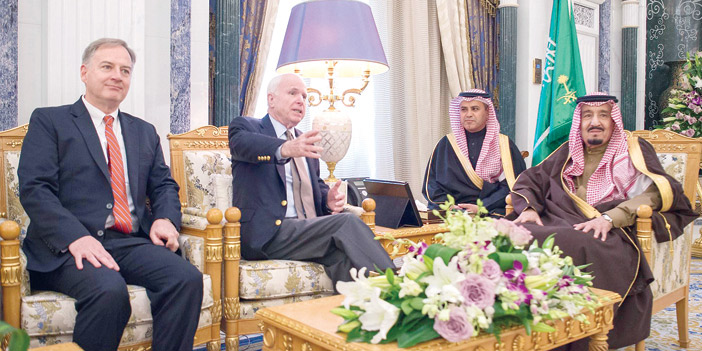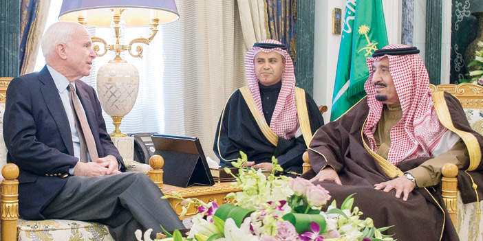 استقبل خادم الحرمين الشريفين الملك سلمان بن عبدالعزيز آل سعود - حفظه الله - في مكتبه بقصر اليمامة أمس عضو مجلس الشيوخ الأمريكي السيناتور جون ماكين. وتم خلال الاستقبال استعراض علاقات الصداقة بين المملكة والولايات المتحدة الأمريكية.