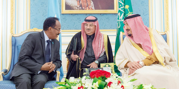 وكان خادم الحرمين الشريفين الملك سلمان بن عبدالعزيز آل سعود - حفظه الله - قد استقبل في قصر اليمامة أمس، فخامة الرئيس محمد عبدالله فرماجو رئيس جمهورية الصومال الفدرالية. كما كان في استقبال فخامته لدى وصوله يرافقه صاحب السمو الملكي الأمير فيصل بن بندر بن عبدالعزيز أمير منطقة الرياض، صاحب السمو الملكي الأمير محمد بن نايف بن عبدالعزيز ولي العهد نائب رئيس مجلس الوزراء وزير الداخلية. وقد أجريت لفخامة الرئيس الصومالي، مراسم استقبال رسمية، حيث عزف السلامان الوطنيان للبلدين، ثم استعرض حرس الشرف. بعد ذلك صافح فخامته مستقبليه، صاحب السمو الملكي الأمير خالد بن بندر بن عبدالعزيز مستشار خادم الحرمين الشريفين، وصاحب السمو الملكي الأمير الدكتور منصور بن متعب بن عبدالعزيز وزير الدولة عضو مجلس الوزراء مستشار خادم الحرمين الشريفين، وصاحب السمو الملكي الأمير متعب بن عبدالله بن عبدالعزيز وزير الحرس الوطني، وأصحاب المعالي الوزراء، وقادة القطاعات العسكرية.