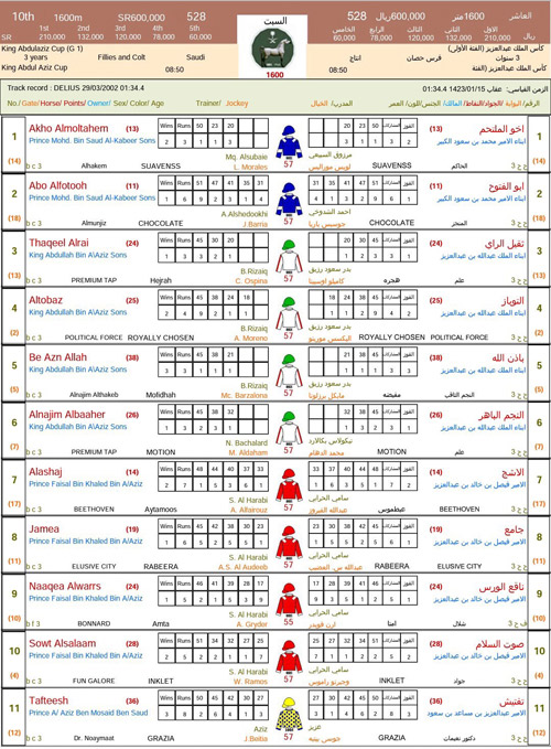 * مالك الخيل والمدرب فيصل العيضاني رشح الجواد (بإذن الله) ثم (ثقيل الراي) ثم (صوت السلام) والمفاجأة (أخو الملتحم).