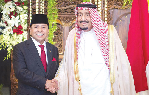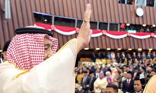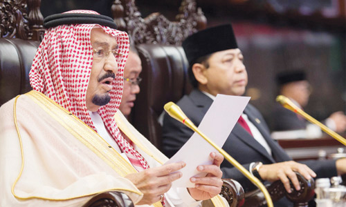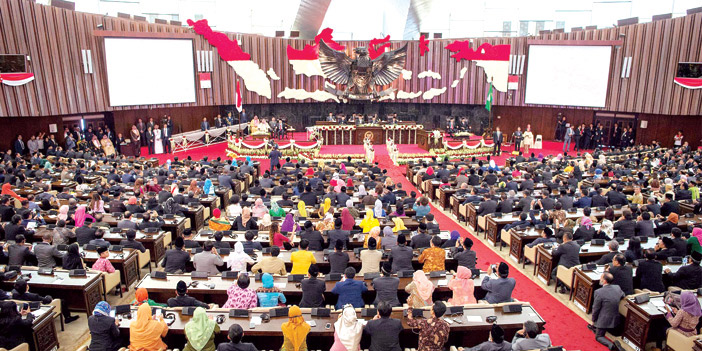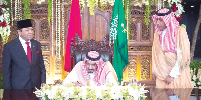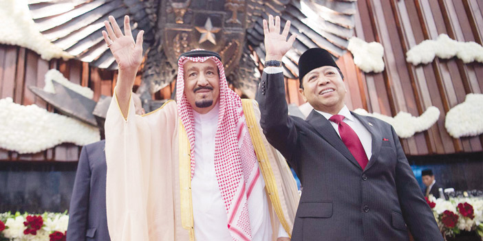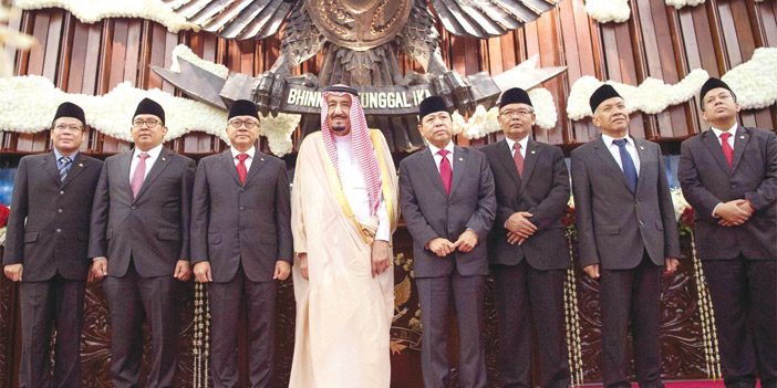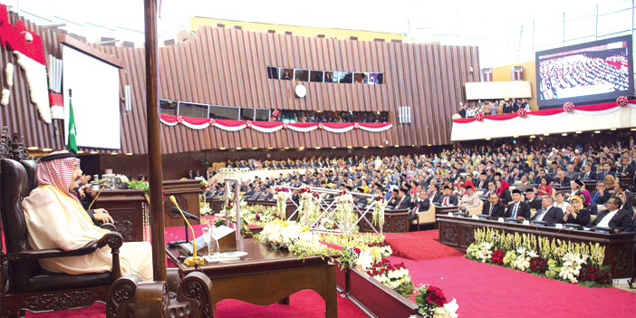 وبعد أن أخذ خادم الحرمين الشريفين مكانه في قاعة البرلمان، شاهد -حفظه الله- والحضور فيلماً عن العلاقات الوثيقة بين المملكة وإندونيسيا. ثم ألقى معالي رئيس مجلس النواب الإندونيسي كلمة عدَّ هذه الزيارة التاريخية لخادم الحرمين الشريفين توثيقا لعلاقات الأخوة بين البلدين الشقيقين. وأشاد معاليه برؤية المملكة 2030، وأهدافها المستقبلية. وأشار إلى التحديات التي تواجه العالم وأهمية التعاون لتحقيق الأمن والسلام. وقد ألقى خادم الحرمين الشريفين الملك سلمان بن عبدالعزيز آل سعود - حفظه الله - الكلمة التالية: «بسم الله والحمدُ لله والصلاةُ والسلامُ على رسول الله.. معالي رئيس مجلس النواب الإخوة والأخوات الأفاضل.. السلامُ عليكم ورحمةُ الله وبركاتُه: أودُّ أن استهل كلمتي بالإعراب عن بالغ تقديرنا لحكومة وشعب الجمهورية الإندونيسية الشقيقة على حفاوة الاستقبال وكرم الضيافة مُبدياً سعادتي بوجودي معكم. إن هذه الزيارةَ لبلدكم الشقيق وما سبقها من زيارة لأخي فخامة الرئيس للمملكة والزيارات المتبادلة بينَ المسؤولين في البلدين، تأتي لتعزيز التعاون بيننا في جميع المجالات بما يخدمُ مصالحَ وتطلعات شعبينا الشقيقين. الحضورُ الكرام إن التحديات التي تواجهُ أمتنَا الإسلاميةَ خاصة، والعالمَ بصفة عامة، وفي مقدمتها ظاهرة التطرف والإرهاب وصدامُ الثقافات وعدمُ احترام سيادة الدول والتدَخلُ في شؤونها الداخلية، تستدعي أن نقفَ صفاً واحداً في مواجهة هذه التحديات، وأن ننسقَ المواقفَ والجهودَ، بما يخدمُ مصالحَنا المشتركةَ والأمن والسلمَ الدوليين. وفي الختام أشيد بدور مجلسكم الموقر في تعزيز العلاقات بين بلدينا الشقيقين في جميع المجالات، كما أشيدُ بما تمَّ توقيعُه في هذه الزيارة من اتفاقيات ومذكرات تفاهم بين البلدين. أسألُ المولى سبحانَهُ وتعالى أن يوفقَنا لما يحبُّه ويرضاه. والسلامُ عليكم ورحمةُ الله وبركاتُه». ثم التقطت الصور التذكارية بهذه الناسبة. وفي ختام الزيارة قدم خادم الحرمين الشريفين هدية تذكارية لمجلس النواب الإندونيسي، كما تلقى -أيده الله- هدية بهذه المناسبة.