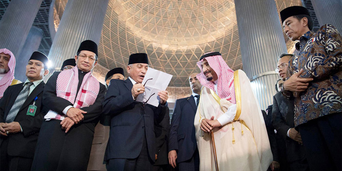 وقد أدى خادم الحرمين الشريفين، وفخامة الرئيس الإندونيسي، ركعتي السنة.. ثم قدم الملك المفدى هدية تذكارية لمسجد الاستقلال بجاكرتا عبارة عن حزام الكعبة المشرفة. واستمع خادم الحرمين الشريفين إلى إيجاز عن تاريخ تأسيس المسجد ومراحل إنشائه، ودوره في تحفيظ القرآن الكريم ونشر العلم.