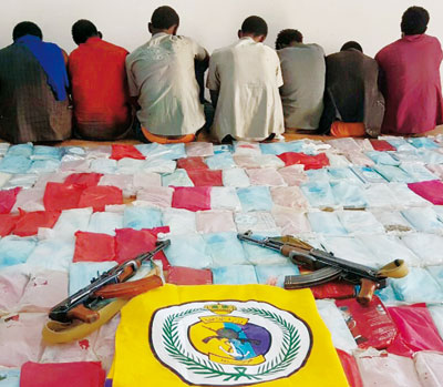 تمكن رجال حرس الحدود بمنطقة جازان من إحباط عدة محاولات لتهريب كميات من مادة الحشيش المخدر. وأوضح المتحدث الرسمي لحرس الحدود العقيد البحري الركن ساهر بن محمد الحربي أنه تم رصد أشخاص حاولوا الدخول للحدود السعودية عبر مسؤوليات منطقة جازان مما حتم التعامل معهم بكل حزم وقوة ونتج عن ذلك القبض على (7) أشخاص من الجنسية الإثيوبية.. وكان مجموع ما قبض عليه (430,5) كيلوجرام من الحشيش المخدر، هذا وقد تم إحالة الأشخاص والمضبوطات إلى الجهات المختصة لإكمال الإجراءات النظامية.