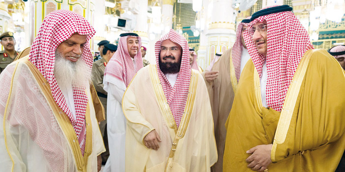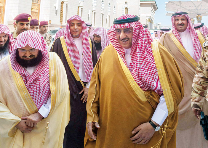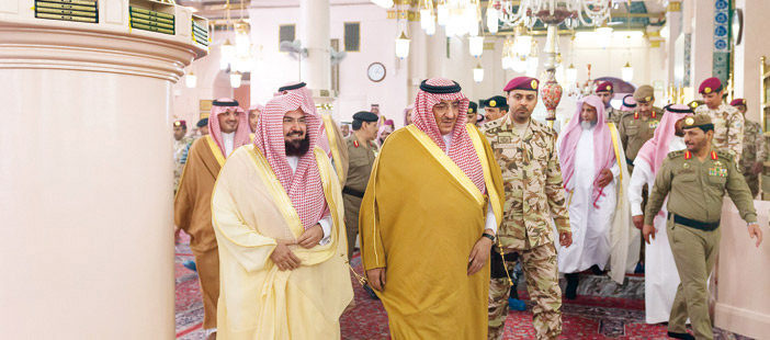 قام نائب خادم الحرمين الشريفين صاحب السمو الملكي الأمير محمد بن نايف بن عبدالعزيز -حفظه الله- أمس بزيارة إلى المسجد النبوي، حيث أدى ركعتي تحية المسجد في الروضة الشريفة، ثم تشرّف بالسلام على رسول الله محمد صلى الله عليه وسلم وعلى صاحبيه رضي الله عنهما. رافق نائب خادم الحرمين الشريفين خلال الزيارة، صاحب السمو الملكي الأمير فيصل بن سلمان ابن عبدالعزيز أمير منطقة المدينة المنورة، وصاحب السمو الملكي الأمير عبدالعزيز بن سعود بن نايف بن عبدالعزيز مستشار سمو وزير الداخلية، وصاحب السمو الملكي الأمير نواف ابن نايف بن عبدالعزيز، ومعالي الرئيس العام لشؤون المسجد الحرام والمسجد النبوي الشيخ الدكتور عبدالرحمن بن عبدالعزيز السديس، وعدد من أصحاب المعالي، ونائب الرئيس العام لشؤون المسجد النبوي الدكتور علي العبيد، وأئمة المسجد النبوي، ومساعد مدير الأمن العام لأمن الحج والعمرة اللواء سعد الخليوي، وقائد قوة أمن المسجد الحرام اللواء محمد وصل الأحمدي، وعدد من المسؤولين في الرئاسة العامة لشؤون المسجد النبوي.