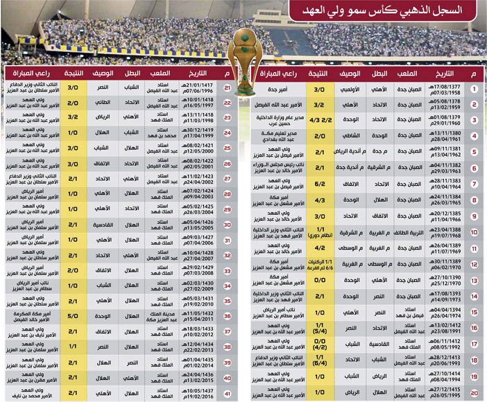 ويتصدر فريق الهلال قائمة أبطال كأس ولي العهد التي تقام اليوم المباراة النهائية لنسختها الـ 42، حيث انطلقت عام 1377 ومرت بعدة متغيرات وتوقفات حتى عادت في موسم 1411هـ بثوبها الجديد.