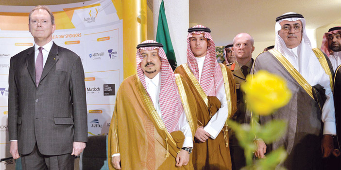 وفي وقت لاحق شرّف صاحب السمو الملكي الأمير فيصل بن بندر بن عبدالعزيز أمير منطقة الرياض, مساء أمس، حفل سفارة دولة أستراليا لدى المملكة بمناسبة ذكرى اليوم الوطني لبلادها، وذلك بمنزل السفير بحي السفارات بالرياض. وكان في استقبال سموه في مقر الحفل سفير دولة أستراليا لدى المملكة الدكتور رائف كينج، وعدد من المسئولين بالسفارة. حضر الحفل صاحب السمو الملكي الأمير فيصل بن محمد بن فيصل بن بندر بن عبدالعزيز, ووكيل وزارة الخارجية لشؤون المراسم عزام بن عبدالكريم القين، وعدد من أعضاء السلك الدبلوماسي المعتمدين لدى المملكة.