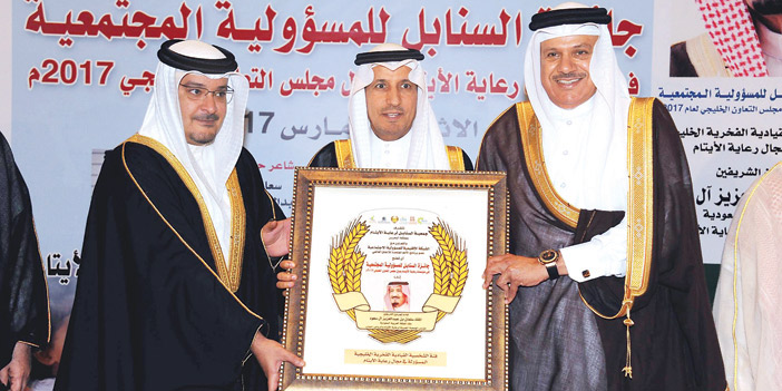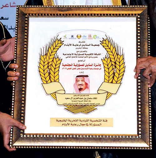 مُنحت لخادم الحرمين الشريفين الملك سلمان بن عبدالعزيز آل سعود -حفظه الله- جائزة الشخصية القيادية الفخرية في مجال رعاية الأيتام، وذلك خلال حفل التكريم بجائزة السنابل للمسؤولية المجتمعية لمؤسسات رعاية الأيتام بدول مجلس التعاون الخليجي 2017 م، التي تنظمها جمعية السنابل لرعاية الأيتام في مملكة البحرين. وتسلم جائزة خادم الحرمين الشريفين نيابة عنه -أيده الله- معالي وزير العمل والتنمية الاجتماعية الدكتور علي بن ناصر الغفيص، كما تسلم جائزة وزارة العمل والتنمية الاجتماعية في فئة الوزارات الخليجية المسؤولة في مجال رعاية الأيتام.