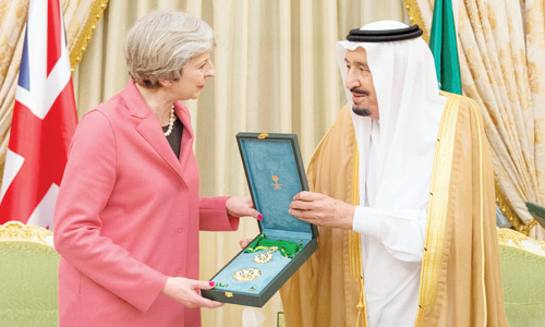 عقد خادم الحرمين الشريفين الملك سلمان بن عبدالعزيز آل سعود -حفظه الله- في قصر اليمامة بالرياض أمس جلسة مباحثات رسمية مع دولة رئيسة وزراء بريطانيا تيريزا ماي. وفي بداية الجلسة منح خادم الحرمين الشريفين -أيده الله- دولة رئيسة وزراء بريطانيا وشاح الملك عبدالعزيز. عقب ذلك جرى استعراض العلاقات الثنائية وأوجه التعاون بين البلدين الصديقين في شتى المجالات، وسبل تطويرها وتعزيزها، إضافة إلى بحث مستجدات الأوضاع الإقليمية والدولية.