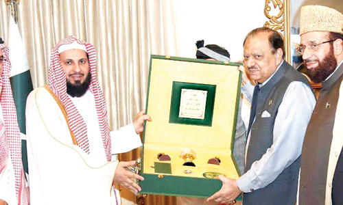 استقبل فخامة الرئيس ممنون حسين رئيس جمهورية باكستان الإسلامية في القصر الرئاسي بإسلام آباد أمس فضيلة إمام وخطيب المسجد الحرام الشيخ صالح بن محمد آل طالب الذي يزور باكستان حالياً.