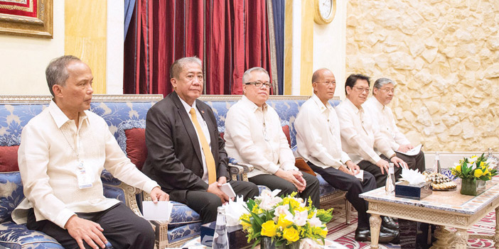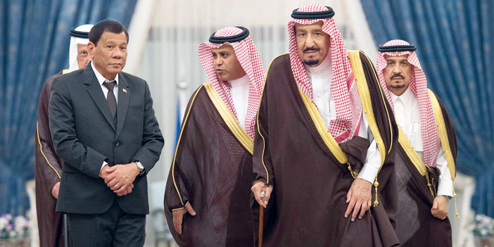 عقد خادم الحرمين الشريفين الملك سلمان بن عبدالعزيز آل سعود -حفظه الله- في روضة خريم أمس، جلسة مباحثات رسمية مع فخامة الرئيس رودريغو روا دوتيرتي رئيس جمهورية الفلبين. وجرى خلال الجلسة استعراض العلاقات الثنائية وأوجه التعاون بين البلدين الصديقين، وسبل دعمها وتعزيزها في مختلف المجالات، بالإضافة إلى بحث مستجدات الأوضاع على الساحة الدولية. وعقب جلسة المباحثات وبحضور خادم الحرمين الشريفين وفخامة الرئيس الفلبيني، جرى توقيع اتفاقية ومذكرة مشاورات وبرنامج تعاون بين حكومتي المملكة العربية السعودية وجمهورية الفلبين. فقد تم توقيع اتفاقية في مجال توظيف العمالة العامة بين وزارة العمل والتنمية الاجتماعية في المملكة ووزارة العمل والتوظيف في الفلبين، وقعها من الجانب السعودي معالي وزير العمل والتنمية الاجتماعية الدكتور علي بن ناصر الغفيص، ومن الجانب الفلبيني معالي وزير الخارجية المكلف إنريكي مانالو. كما تم توقيع مذكرة المشاورات السياسية بين وزارتي الخارجية في البلدين، وكذلك برنامج تعاون بين معهد الأمير سعود الفيصل للدراسات الدبلوماسية، ومعهد الخدمة الخارجية الفلبيني، وقعهما من الجانب السعودي معالي وزير الدولة للشؤون الخارجية الدكتور نزار بن عبيد مدني، ومن الجانب الفلبيني معالي وزير الخارجية المكلف إنريكي مانالو. حضر جلسة المباحثات ومراسم التوقيع، صاحب السمو الملكي الأمير فيصل بن بندر بن عبدالعزيز أمير منطقة الرياض، وصاحب السمو الملكي الأمير متعب بن عبدالله بن عبدالعزيز وزير الحرس الوطني، وصاحب السمو الملكي الأمير محمد بن سلمان بن عبدالعزيز ولي ولي العهد النائب الثاني لرئيس مجلس الوزراء وزير الدفاع، ومعالي وزير الدولة عضو مجلس الوزراء الدكتور مساعد بن محمد العيبان، ومعالي وزير الدولة عضو مجلس الوزراء الدكتور إبراهيم بن عبدالعزيز العساف، ومعالي وزير الثقافة والإعلام الدكتور عادل بن زيد الطريفي، ومعالي وزير المالية الأستاذ محمد بن عبدالله الجدعان، ومعالي وزير العمل والتنمية الاجتماعية الدكتور علي بن ناصر الغفيص (الوزير المرافق)، ومعالي وزير الدولة للشؤون الخارجية الدكتور نزار بن عبيد مدني، وسفير خادم الحرمين الشريفين لدى جمهورية الفلبين الدكتور عبدالله بن ناصر البصيري. كما حضرها من الجانب الفلبيني، معالي وزير الخارجية المكلف إنريكي مانالو، ومعالي وزير العمل والتوظيف سيلفيستر اتش بيلو،معالي وزير الدفاع دليفين لورينز انا، ومعالي وزير التجارة والصناعة رامون لوبيز، ومعالي وزير المواصلات أرثور توغادي، ومعالي وزير الطاقة الفونسو كوسي، ومعالي مستشار أمن الدولة هيرمو هينيس، ومعالي المستشار الرئاسي لشؤون العمال عبدالله دي ماماؤو، ومعالي رئيس سلطنة مينداناو للتطوير داتو حاج أبوالخير، ومعالي عضو مجلس الشيوخ السيناتور ألان بيتير كاياتانو، والقائم بالأعمال بسفارة الفلبين بالمملكة إيميلدا بانولونج، ومعالي المساعد الخاص للرئيس كريستوفير لاورينس تي غور.