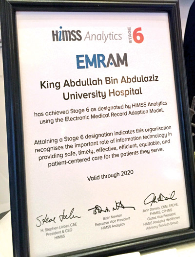 حصل مستشفى الملك عبدالله بن عبدالعزيز الجامعي بجامعة الأميرة نورة بنت عبدالرحمن على جائزة الجمعية الأمريكية لنظم إدارة المعلومات الصحية، وكذلك حصل على تصنيف المستوى السادس؛ ليكون من أوائل المستشفيات الجامعية في المملكة التي تحقق هذا المستوى في سنته التشغيلية الأولى، وذلك بعد أن حقق المستشفى كل المتطلبات التي تتمثل في تطبيق أعلى معايير الجودة في استخدام الملف الصحي الإلكتروني والتطبيقات الصحية الإلكترونية كافة، التي تعزز من الرعاية الصحية ومقومات سلامة المرضى.