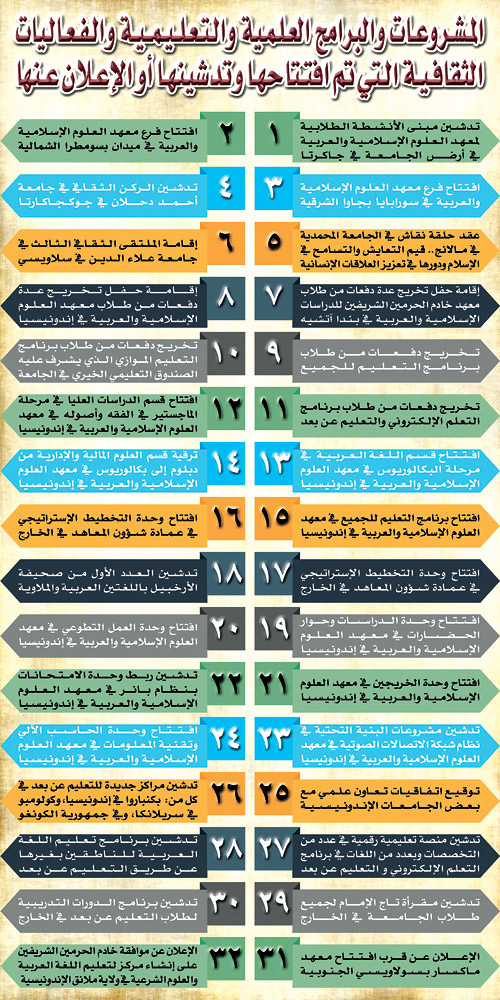 تواجدت جامعة الإمام محمد بن سعود الإسلامية، في جمهورية إندونيسيا الشقيقة بشكل فاعل، طيلة الأسبوع الماضي، حيث أطلقت جملة من المبادرات المتنوعة، شملت افتتاح فروع في ثلاث مدن إندونيسية لمعهدها للعلوم الإسلامية والعربية، الذي يتخذ من العاصمة جاكرتا مقراً. كما دشنت جملة من الفعاليات العلمية والتعليمية والثقافية.