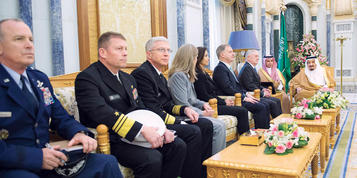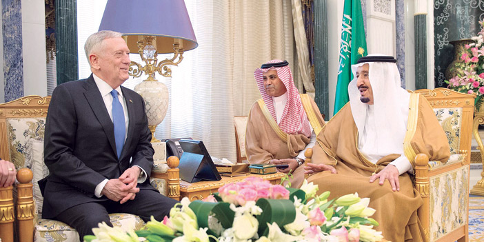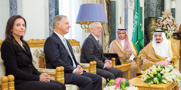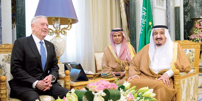 استقبل خادم الحرمين الشريفين الملك سلمان بن عبدالعزيز آل سعود - حفظه الله - في مكتبه بقصر اليمامة أمس معالي وزير الدفاع الأمريكي جيمس ماتيس. وجرى خلال الاستقبال بحث سبل تعزيز علاقات الصداقة الاستراتيجية بين المملكة والولايات المتحدة الأمريكية، وبخاصة في المجال الدفاعي، وتطورات الأحداث الإقليمية والدولية.