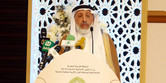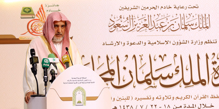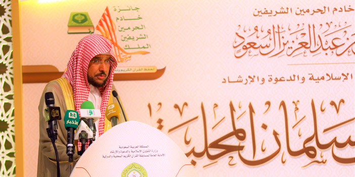 ثم ألقى وزير الشؤون الإسلامية والدعوة والإرشاد معالي الشيخ: صالح بن عبدالعزيز بن محمد آل الشيخ كلمة وجه فيها شكره لمقام خادم الحرمين الشريفين إزاء ما يقدمه من خدمة لكتاب الله تعالى، وتكريم لأهل القرآن، وقال معاليه: لقد تكفل الله تعالى بحفظ كتابه الكريم، واعتنى النبي صلى الله عليه وسلم بالقراء من الصحابة الكرام، وكان يكرم أهل القرآن بقوله عليه الصلاة والسلام:» أهل القرآن هم أهل الله وخاصته.»