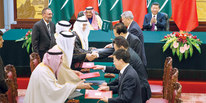 وشهد خادم الحرمين الشريفين الملك سلمان بن عبدالعزيز آل سعود – حفظه الله – وفخامة الرئيس شي جين بينغ رئيس جمهورية الصين الشعبية في قاعة الشعب الكبرى بالعاصمة الصينية بكين، توقيع مذكرات تفاهم وتعاون وبرامج بين حكومتي المملكة العربية السعودية وجمهورية الصين الشعبية. وقد جرى توقيع مذكرة تفاهم للإطار العام لفرص الاستثمار الصناعي والبنى التحتية، وقعها صاحب السمو الأمير سعود بن عبدالله بن ثنيان رئيس الهيئة الملكية للجبيل وينبع ورئيس مجلس إدارة سابك مع رئيس شركة شمال الصين الصناعية زهي يولين . ووقع البلدان مذكرة تفاهم بشأن تمويل وإنشاء محطات الحاويات والبنى التحتية لمركز الخدمات اللوجستية المتعددة بمدينة ينبع الصناعية، وقعها صاحب السمو الأمير سعود بن عبدالله بن ثنيان رئيس الهيئة الملكية للجبيل وينبع ، رئيس مجلس إدارة سابك مع رئيس الشركة الصينية للبناء والمواصلات لياو تشي تاو . كما جرى توقيع اتفاقية تعاون استراتيجي للاستثمار في مشروعات متعددة ، وقعها صاحب السمو الأمير سعود بن عبدالله بن ثنيان رئيس الهيئة الملكية للجبيل وينبع ، رئيس مجلس إدارة سابك مع رئيس مجلس إدارة شركة ساينويك وانج يوبو . وتم توقيع مذكرة تفاهم للتعاون بشأن مشاركة المملكة في رحلة الصين لاستكشاف القمر (تشانق إي ـ 4) ، وقعها صاحب السمو الأمير تركي بن سعود بن محمد رئيس مدينة الملك عبدالعزيز للعلوم والتقنية مع معالي نائبة رئيس الهيئة الوطنية للفضاء ووي انهوا . كذلك تم توقيع اتفاقية شراكة لتصنيع الطائرات بدون طيار ، وقعها صاحب السمو الأمير تركي بن سعود بن محمد رئيس مدينة الملك عبدالعزيز للعلوم والتقنية مع رئيس مجلس إدارة شركة ( CASA ) لي فانبي . وجرى توقيع مذكرة تفاهم بشأن قائمة مشروعات التعاون في الطاقة الإنتاجية، وقعها معالي عضو مجلس الوزراء وزير الدولة الدكتور إبراهيم بن عبدالعزيز العساف مع معالي خه ليفنغ رئيس اللجنة الوطنية للتنمية والإصلاح . كما تم التوقيع على برنامج تعاون تنفيذي بين هيئة الإذاعة والتلفزيون في المملكة والهيئة الوطنية للإذاعة والتلفزيون والإعلام والنشر بجمهورية الصين الشعبية، وقعه معالي عضو مجلس الوزراء وزير الدولة الدكتور إبراهيم بن عبدالعزيز العساف مع معالي رئيس الهيئة الوطنية العامة للإذاعة والتلفزيون والإعلام والنشر نيه تشنشي . وكذلك التوقيع على برنامج تعاون في المجال التجاري والاستثمار، وقعه معالي وزير الاقتصاد والتخطيط الدكتور عادل بن محمد فقيه مع معالي وزير التجارة تشونغ شان . وتم توقيع مذكرة تعاون في المجال التعليمي، وقعها معالي وزير التعليم الدكتور أحمد بن محمد العيسى مع معالي وزير التربية والتعليم تشن باوشنغ . كما تم توقيع مذكرة تفاهم للتعاون في مجال العمل، وقعها معالي وزير العمل والتنمية الاجتماعية الدكتور علي بن ناصر الغفيص مع معالي وزير الموارد البشرية والضمان الاجتماعي ين ويمين . كما تم التوقيع على مذكرة تفاهم بشأن التعاون في الشؤون التنظيمية للأمان النووي للاستخدامات السلمية للتكنولوجيا النووية، وقعها معالي رئيس مدينة الملك عبدالله للطاقة الذرية والمتجددة الدكتور هاشم بن عبدالله يماني مع معالي وزير حماية البيئة تشن جينينغ . وكذلك تم التوقيع على اتفاقية عمل دراسة جدوى لمشاريع المفاعل النووي عالي الحرارة المبرد بالغاز بالمملكة العربية السعودية، وقعها معالي رئيس مدينة الملك عبدالله للطاقة الذرية والمتجددة الدكتور هاشم بن عبدالله يماني مع مدير عام شركة CNEC قو جين . ووقعت أيضاً مذكرة تفاهم للتعاون في مجال رواسب اليورانيوم، والثوريوم ، وقعها معالي رئيس هيئة المساحة الجيولوجية الدكتور زهير بن عبدالحفيظ نواب مع رئيس مجلس إدارة شركة CNEC وانغ شو تشون . كما تم التوقيع على اتفاقية تعاون في مجال ضمان ائتمان الصادرات، وقعها مدير عام برنامج الصادرات أحمد بن محمد الغنام مع رئيس مجلس إدارة شركة SINSURE وانغ يي .