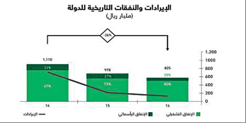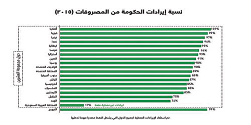 الجدير بالذكر أن نسبة إيرادات الحكومة مقارنة بالمصروفات تعد الأدنى حين المقارنة بدول العشرين. فعلى سبيل المثال في عام 2015 كانت النسبة للمملكة العربية السعودية 17 في المئة، فقط للإيرادات غير النفطية مقارنة بالهند 74 في المئة وإندونيسيا 85 في المئة، وتركيا 97 في المئة، وتتربع على القائمة ألمانيا الاتحادية بنسبة 101 في المئة، حيث تم تحقيق تعادل إيرادات الدولة مع مصروفاتها. بالنظر إلى هذه الإحصائيات يتبيّن لدينا أهمية ترشيد الإنفاق الحكومي بل ورفع العوائد غير النفطية كذلك.