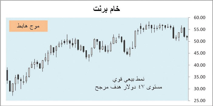 أغلق خام برنت الأسبوع الماضي على نمط بيعي متوسط في مسار هابط على مستوى الحركة الأسبوعية مع استمرار ضعف الدولار الذي كسر الحاجز المئوي وصولاً لمستوى 98 أمام سلة عملاته؛ وذلك لاختناق العرض والطلب في السوق العالمية. ولا يزال خام برنت يجهز نفسه لتشييد قمة هابطة عظمى على المديين الطويل والمتوسط. ويرجح الأسبوع المقبل أن يواصل الهبوط، ويكسر 50 دولارًا وصولاً لمستوى 47 دولارًا.