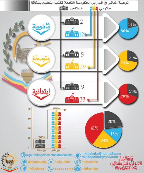 نشر مكتب التعليم بمدينة سكاكا، التابع لتعليم منطقة الجوف، «إنفوجرافيك» يبين نوعية المباني في المدارس الحكومية التابعة للمكتب بين المُستأجر والحكومي، وأظهر المنشور أن نسبة 80 % من مباني المدارس في قطاع سكاكا حكومي، بينما 20 % مستأجر.