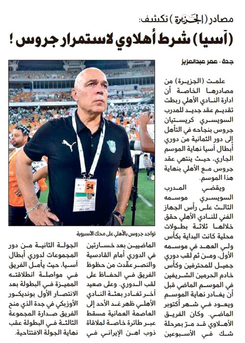 أعلن رئيس النادي الأهلي أحمد المرزوقي أن ناديه سيفعّل خيار التجديد في عقد المدرب السويسري كريستيان جروس في حال نجح في قيادة الفريق إلى دور الثمانية من دوري أبطال آسيا لهذا الموسم، وقال: نمتلك خيارًا للتجديد في عقدنا مع المدرب جروس، وقد اتفقنا معه قبل التوقيع على العقد في أكتوبر الماضي على استمراره موسمًا آخر في حال تجاوز دور الستة عشر من المسابقة الآسيوية، والوصول إلى دور الثمانية، ولكن بكل تأكيد لن يدخل هذا الاتفاق حيز التنفيذ إلا في حالة موافقة الطرفين في نهاية الموسم على استمرار العلاقة التعاقدية بينهما. وصادق الرئيس الأهلاوي بإعلانه بند التجديد مع جروس على تميُّز (الجزيرة) في عددها الصادر في الخامس والعشرين من شهر فبراير، التي ذكرت من خلاله أن مسيّري النادي الأهلي ربطوا استمرار جروس موسمًا آخر مع الأهلي بتأهله إلى دور الثمانية من دوري أبطال آسيا.