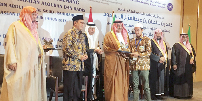 كرَّم صاحب السمو الملكي الأمير خالد بن سلطان بن عبدالعزيز رئيس مجلس أمناء مؤسسة سلطان بن عبدالعزيز آل سعود الخيرية، في العاصمة الإندونيسية جاكرتا، الفائزين بمسابقة الأمير سلطان بن عبدالعزيز آل سعود السنوية لحفظ القرآن الكريم والسنة النبوية على مستوى دول آسيان والباسفيك ودول آسيا الوسطى والشرقية. وبدئ الحفل المعد بهذه المناسبة بآيات من الذكر الحكيم، ثم ألقى سفير خادم الحرمين الشريفين لدى جمهورية إندونيسيا أسامة بن محمد الشعيبي كلمة هنأ فيها الجميع بنجاح المسابقة التي تتطور كل عام, كما هنأ سمو الأمير خالد بن سلطان على نجاح المسابقة، والفائزين في مسابقة الأمير سلطان بن عبدالعزيز آل سعود للقرآن الكريم والسنة النبوية، وقدم الشعيبي الشكر لحكومة جمهورية إندونيسيا وللجان المسابقة، مبرزاً أهمية المسابقة التي وصفها بأنها نموذج من اهتمام حكومة خادم الحرمين الشريفين بالعناية بالقرآن والسنة, منوهاً بعمق العلاقات بين البلدين الشقيقين. بعد ذلك ألقى إمام وخطيب مسجد قباء بالمدينة المنورة الشيخ صالح بن عواد المغامسي، كلمة تناول فيها فضل القرآن ومكانته وفضل قارئ القرآن وما يتصف به من أخلاق رفيعة وصفات فضيلة وعلو أجره، منوهاً بدور مؤسسة سلطان بن عبدالعزيز آل سعود الخيرية، في خدمة كتاب الله الكريم والسنة النبوية. وأكد فضيلته أن تنظيم مثل هذه المسابقات القرآنية الدولية يجسد مكانة المملكة العربية السعودية ودورها الريادي في العالم الإسلامي، موصياً بأهمية تدبر القرآن الكريم وفهم معانيه والعمل بما فيه. وقدم الشيخ المغامسي الشكر لسمو الأمير خالد بن سلطان بن عبدالعزيز على رعايته لحفل تتويج الفائزين، داعياً الله أن يجزل له المثوبة. عقب ذلك قُدم عرض مرئي تناول مسيرة مسابقة الأمير سلطان بن عبدالعزيز لحفظ القرآن الكريم والسنة النبوية منذ انطلاقتها الأولى، ثم استمع الحضور لنماذج من قراءة المتسابقين