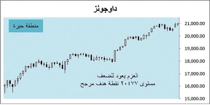 أغلق مؤشر الداوجونز الأسبوع الماضي على نمط شرائي ضعيف عند 21006 نقطة داخل منطقة حيرة وبعزم ضعيف وتوقف عن تسجيل قمة تاريخية جديدة، وكانت شهية المخاطرة قد تراجعت في أسواق الأسهم الأمريكية إلا أنها كانت السوق الأفضل بعد هبوط كبير لخامات النفط والعملات خصوصاً الدولار مقارنة بالأسابيع الماضية منذ بداية العام ويتضح أن الأسبوع القادم يميل للهبوط إلى مستوى 20477 نقطة بنمط بيعي قوي.