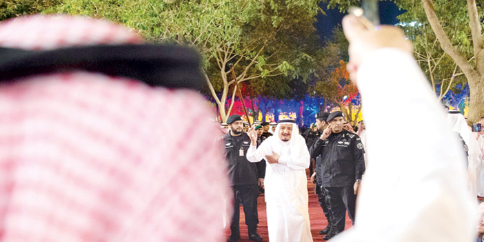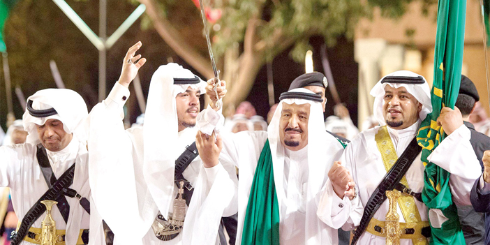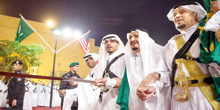 ولدى وصول فخامته، أديت العرضة السعودية، وشارك خادم الحرمين الشريفين، وفخامة الرئيس الأمريكي في أداء العرضة.