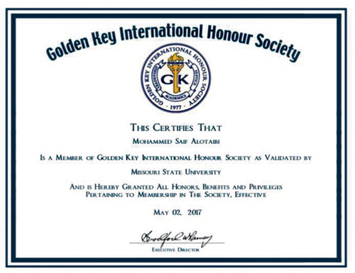 حصل المبتعث محمد سيف العتيبي على درجة ماجستير الرياضيات في التحليل المركب من جامعة ولاية ميزوري، كما حصل على جائزة المفتاح الذهبي للشرف العالمي (Golden Key International Honour Society) التي تعنى بتكريم أفضل 15% من الطلاب المتفوقين في أكثر من 400 جامعة حول العالم. ويعد الفوز بعضويتها من اعلى جوائز الشرف الجامعي التي يحصل عليها الطلاب.