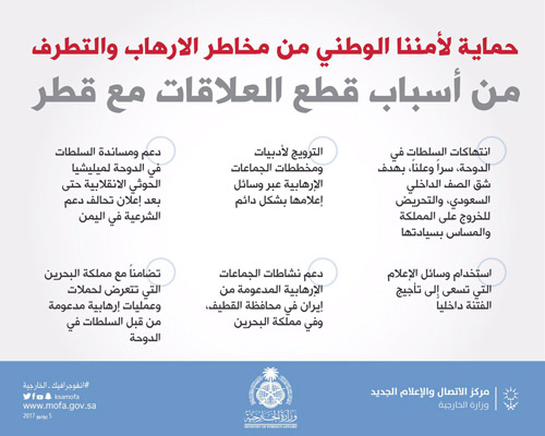 صرح مصدر مسؤول أن حكومة المملكة العربية السعودية انطلاقاً من ممارسة حقوقها السيادية التي كفلها القانون الدولي، وحماية لأمنها الوطني من مخاطر الإرهاب والتطرف، فإنها قررت قطع العلاقات الدبلوماسية والقنصلية مع دولة قطر، كما قررت إغلاق كافة المنافذ البرية والبحرية والجوية، ومنع العبور في الأراضي والأجواء والمياه الإقليمية السعودية، والبدء بالإجراءات القانونية الفورية للتفاهم مع الدول الشقيقة والصديقة والشركات الدولية لتطبيق ذات الإجراء بأسرع وقت ممكن لكافة وسائل النقل من وإلى دولة قطر، وذلك لأسباب تتعلق بالأمن الوطني السعودي.