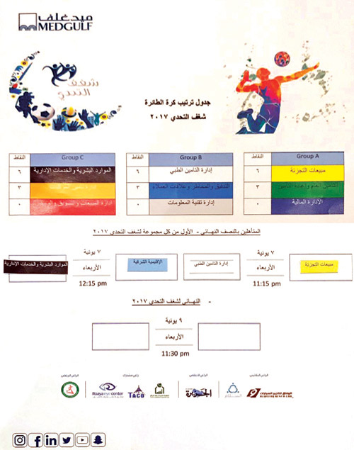 وأضاف الزويدي: «من خلال اطلاعنا على التغطية الإعلامية لمسنا تفاعلاً إيجابياً من كثير من الموظفين والموظفات وأطفالهم الذين أضافوا رونقاً وبهجة بوجودهم ومشاركتهم بالأنشطة والمسابقات المصاحبة لدوري شغف التحدي ميدغلف 2017»، مؤكداً أن الهدف الأساسي من هذه الفعالية ليس الفوز والخسارة وإنما خلق جو أسري داخل شركتنا وتعزيز روح الفريق الواحد»، متمنياً للجميع التوفيق وكل عام وأنتم بخير».