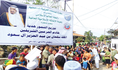يواصل مكتب رابطة العالم الإسلامي وهيئة الإغاثة الإسلامية في إندونيسيا، توزيع هدية خادم الحرمين الشريفين الملك سلمان بن عبدالعزيز آل سعود -حفظه الله- من التمور للشعب الإندونيسي بالتعاون مع سفارة المملكة العربية السعودية في إندونيسيا. وأوضح مدير مكتب رابطة العالم الإسلامي وهيئة الإغاثة المشرف على الحملة فهد الحربي أن الحملة تأتي بتوجيه من سفير خادم الحرمين الشريفين في إندونيسيا، مشيراً إلى أن 50 طناً من التمور وزعت في العديد من المناطق في اندونيسيا،واستفادت منها 20 ألف أسرة وما زال التوزيع مستمراً في هذا الشهر الكريم.