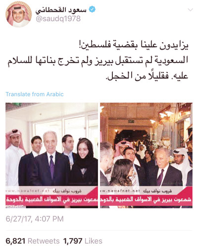 وأضاف قائلاً: « العبارات التي تستخدم من خلايا عزمي هي جزء من استراتيجية عزمي الإعلامية طوال السنوات الماضية، وفضحوا أنفسهم بسذاجة بالغة مع الأزمة الأخيرة. وفي حين أرفق ضمن تغريداته صوراً لنائب رئيس الوزراء الإسرائيلي سابقاً شيمون بيريز خلال زيارته لقطر.. قال القحطاني: «يزايدون علينا بقضية فلسطين! السعودية لم تستقبل بيريز ولم تُخرج بناتها للسلام عليه فقليلاً من الخجل»، وزاد: «خلايا عزمي عضو الكنيست الإسرائيلي يصفون قناة العربية بالعبرية، فهل كان بيريز أسيراً بقناة الجزيرة وهو يتجول فيها تجول من يملك المكان؟». وفي تعليقه على صورة تضمنتها تغريداته لاستقبال أمير قطر السابق حمد بن خليفة لبيريز، علق القحطاني: «يزايدون علينا بقضية فلسطين؟ فمن الذي استقبل بيريز بدويلته استقبال الفاتحين ونشر صورته معه وهو من المفاخرين؟».