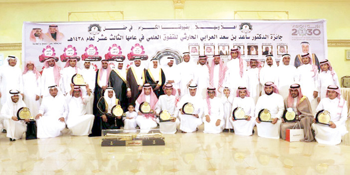 احتفلت جائزة الدكتور ساعد بن سعد العرابي الحارثي، مساء أول أمس، بتكريم (55) متفوّقًا ومتفوّقة، من مختلف المراحل التعليمية لعام 1438، بحضور نخبة من المثقفين، ورجال التعليم، وأعيان محافظة الطائف، ومديري الدوائر الحكومية بالمنطقة. واشتمل حفل التكريم، الذي أقيم في قاعة السلام بالطائف، على تكريم 17طالبًا وطالبة من المتفوّقين من حملة الثانوية العامة، وعدد 14 من حملة البكالوريوس الذين حصلوا عليها أثناء العمل، وعدد 3 من حملة درجة الماجستير وواحد من حملة الدكتوراه، و22 من حفظة كتاب الله، بالإضافة إلى تكريم عدد من المعلمين والمعلمات الذين خدموا في سلك التعليم. ثم تولت فقرات الحفل بكلمة لصاحب الجائزة الدكتور ساعد العرابي الحارثي، رحب فيها بالحضور، وهنأ المكرّمين من الطلبة والطالبات على هذا الجهد والتفوّق.