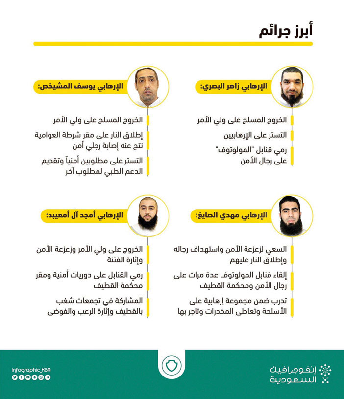 وقد أسفر التحقيق معهم عن توجيه الاتهام لهم بارتكابهم تلك الجرائم وبإحالتهم للقضاء صدرت بحقهم أحكام شرعية تقضي بثبوت ما نسب إليهم شرعاً، والحكم عليهم بالقتل تعزيراً وصُدّقت الأحكام من محكمة الاستئناف المختصة، ومن المحكمة العليا، وصدر أمر ملكي بإنفاذ ما تقرر شرعاً وصُدّق من مرجعه بحق الجناة المذكورين، وقد نُفذ ما تقرر شرعاً بحقهم أمس الثلاثاء الموافق 17 - 10 - 1438هـ في المنطقة الشرقية.