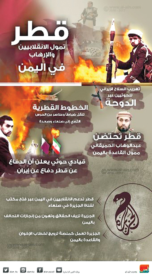 وكان وكيل وزارة الإعلام اليمني نجيب غلاب قد أورد أن الدوحة تقف وراء ما حدث لجيش الحكومة الشرعية من اغتيالات لقيادات كبيرة من خلال دعمها جماعات متطرفة لتنفيذ هذه المهمة، مؤكداً أن الدوحة عملت على مسارين، الأول دعم الحوثيين مالياً ومعلوماتياً وإرسال الإحداثيات بما يجعلهم قادرين على الاستمرار والتهرب من ضربات مقاتلات التحالف العربي، والثاني يتمثل في اختراق مكونات الشرعية.