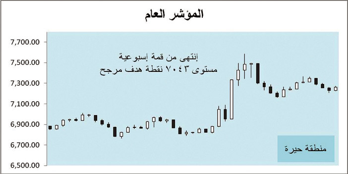 افتتح المؤشر العام الأسبوع الماضي على صعود وصلت ذروته إلى مستوى 7365 نقطة لكنه كسر الدعم 7290 نقطة وعاد بموجة جني أرباح مربكة وأغلق على نمط بيعي متوسط داخل منطقة الحيرة على مستوى الحركة الأسبوعية، وكان الضغط من أسواق النفط وحيرة النتائج المالية التي لم تظهر تفاصيلها بعد والسيولة المجمعة للأسبوع ضعيفة بسبب حظر تعاملات التنفيذيين وقاد جني الأرباح سهم سابك بعد كسره للحاجز المئوي.