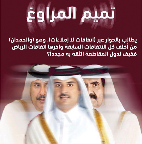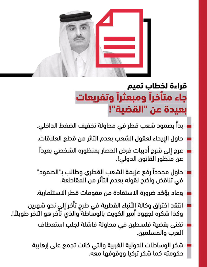 «وقعت في شر أعمالها».. ذلك الوصف الدقيق - إن صح التعبير - لحال الدوحة الآن.. فقد حمل الخطاب الأخير لأمير قطر.. دلالات واضحة لتطابق فحواه مع التصريحات التي نقلتها وكالة الأنباء القطرية في 23 مايو.. ذلك ما يبدد مزاعم وادعاءات اختراقها!!.. فعند حديث الشيخ تميم عن اختلاف بلاده مع بعض الدول بشأن مصادر الإرهاب، فهو يمس لُبّ مشكلة الدوحة المتمثلة بالإرهاب ودعمه.. وإجمالاً يُمكن القول إن الخطاب أكد إصرار الدوحة على الانسلاخ عن محيطها الخليجي والعربي.