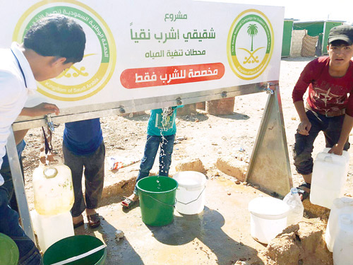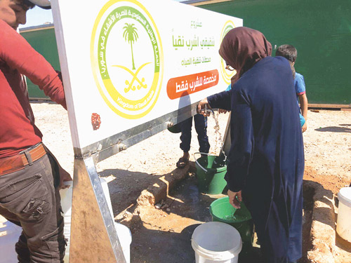 وفرت الحملة الوطنية السعودية لنصرة الأشقاء في سوريا مياه الشرب الصحية وفق أعلى معايير الجودة من خلال خمس محطات لتنقية المياه أنشأتها ليستفيد منها النازحون السوريون على الشريط الحدودي السوري المحاذي للجمهورية التركية، وذلك ضمن أسبوع عملها الـ43 بهذا المشروع. وأوضح مدير مكتب الحملة في تركيا خالد السلامة أن الحملة قامت بتشغيل محطات تنقية المياه لصالح الأشقاء النازحين السوريين ضمن مشروع «شقيقي اشرب نقياً» لتوفير مياه الشرب الصحية لهم لما تقتضيه الحاجة الماسة هناك بالتعاون والتنسيق مع الحكومة التركية وبعض المنظمات العاملة في المجال الإنساني، مبينًا أن الحملة تستهدف إنتاج 20 ألف متر مكعب من المياه النقية في الساعة من خلال 5 محطات لتنقية المياه في الداخل السوري.