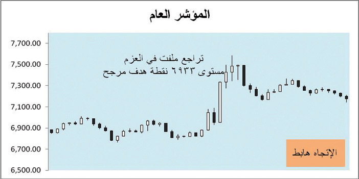 افتتح المؤشر العام الاسبوع الماضي على هبوط وصل قاعه إلى مستوى 7142 نقطة حيث كسر الدعم 7250 نقطة بموجة جني أرباح نتيجة ضغط إعلانات الشركات وبسبب هبوط خام برنت بداية الاسبوع وكان العزم متوسطا في الهبوط والسيولة المجمعة واصلت تراجعها وواضح جدا ارتفاع تكاليف إنتاج السلع والخدمات في الشركات وتأثيره على صافي الأرباح وكان القطاع المصرفي هو الضاغط الأكبر على المؤشر العام في الهبوط .