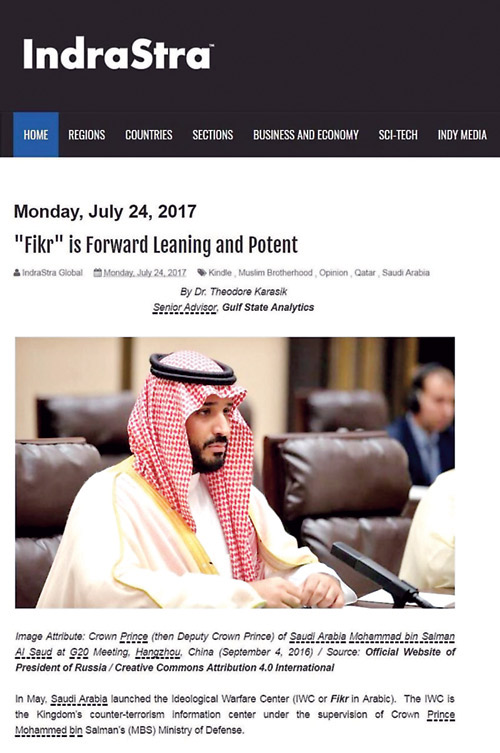 وأكد د.كاراسيك أن قطر «تبدو اليوم معزولة دولياً بسبب دعمها لحركة الإخوان المسلمين التي صنّفتها المملكة عام 2014 باعتبارها تنظيماً إرهابياً»؛ قائلاً إن مركز الحرب الفكرية «كشف في أول رسائله أن حركة الإخوان المسلمين وعملاءها السياسيين تسللت إلى الدول المستهدفة عن طريق أساليب فكرية واستخباراتية» مشيراً إلى أن المركز أوضح أن «حركة الإخوان لا تتآمر فقط ضد العلماء الشرعيين وإنما تستهدف أيضاً الناشطين الوطنيين».
