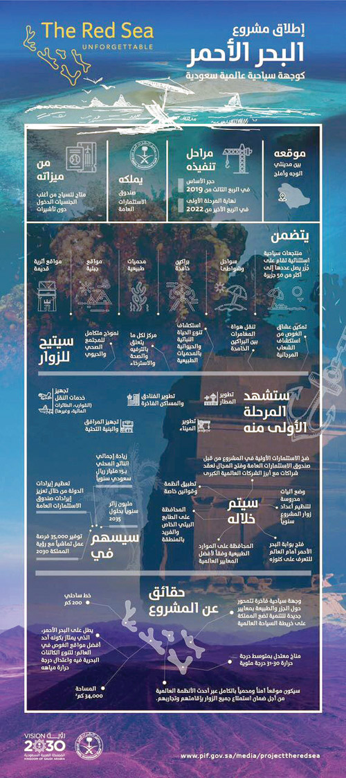 أعلن نائب خادم الحرمين الشريفين صاحب السمو الملكي الأمير محمد بن سلمان بن عبدالعزيز آل سعود، رئيس مجلس إدارة صندوق الاستثمارات العامة أمس عن إطلاق مشروع سياحي عالمي في المملكة تحت مسمى مشروع «البحر الأحمر»، يقام على أحد أكثر المواقع الطبيعية جمالاً وتنوعاً في العالم، بالتعاون مع أهم وأكبر الشركات العالمية في قطاع الضيافة والفندقة، لتطوير منتجعات سياحية استثنائية على أكثر من 50 جزيرة طبيعية بين مدينتي أملج والوجه، وذلك على بُعد مسافات قليلة من إحدى المحميات الطبيعية في المملكة والبراكين الخاملة في منطقة حرة الرهاة. وسيشكل المشروع وجهة ساحلية رائدة، تتربع على عدد من الجزر البكر في البحر الأحمر. وإلى جانب المشروع، تقع آثار مدائن صالح التي تمتاز بجمالها العمراني وأهميتها التاريخية الكبيرة. وعلى بعد دقائق قليلة من الشاطئ الرئيسي، ستتاح للزوار فرصة التعرف على الكنوز الخفية في منطقة مشروع «البحر الأحمر»، ويشمل ذلك محمية طبيعية لاستكشاف تنوع الحياة النباتية والحيوانية في المنطقة. وسيتمكن هواة المغامرة من التنقل بين البراكين الخاملة الواقعة بجوار منطقة المشروع، وعشاق الغوص من استكشاف الشعاب المرجانية الوفيرة في المياه المحيطة به. وإذ تُعد السياحة إحدى أهم القطاعات الاقتصادية في رؤية 2030، سيسهم مشروع «البحر الأحمر» في إحداث نقلة نوعية في مفهوم السياحة وقطاع الضيافة. كما سيتم ترميم المواقع التراثية وتجهيزها على أسس علمية لتكون مهيأة لاستقبال الزوار. فعلى سبيل المثال سيتم تحديد سقف أعلى لعدد الزائرين للتواجد بالمنطقة في آن معاً تماشياً مع أفضل الممارسات العالمية في مجال السياحة والآثار. وتحكم المشروع معايير جديدة تطمح للارتقاء بالسياحة العالمية عبر فتح بوابة البحر الأحمر أمام العالم، من أجل التعرف على كنوزه وخوض مغامرات جديدة تجذب السياح محلياً وإقليمياً وعالمياً على حد سواء، ليكون المشروع مركزاً لكل ما يتعلق بالترفيه والصحة والاسترخاء، ونموذجاً متكاملاً للمجتمع الصحي والحيوي. وحفاظاً على الطابع البيئي الخاص والفريد للمنطقة، سيتم وضع قوانين وآليات تخص الاستدامة البيئية، حيث سيتم العمل على المحافظة على الموارد الطبيعية وفقاً لأفضل الممارسات والمعايير المعمول بها عالمياً. وسيتم تطوير مشروع «البحر الأحمر» كمنطقة خاصة تُطبق فيها الأنظمة وفقاً لأفضل الممارسات والخبرات العالمية لتمين تحقيق أهداف المشروع، حيث سيتم وضع حجر الأساس في الربع الثالث من عام 2019م، والانتهاء من المرحلة الأولى في الربع الأخير من عام 2022م، وهي مرحلة ستشهد تطوير المطار، والميناء، وتطوير الفنادق والمساكن الفخمة، والانتهاء من المرافق والبنية التحتية، وخدمات النقل ( القوارب، والطائرات المائية، وغيرها ). وسيقوم صندوق الاستثمارات العامة بضخ الاستثمارات الأولية في هذا المشروع، ويفتح المجال لعقد شراكات مع أبرز الشركات العالمية الكبرى، مما سيساهم في جلب استثمارات مباشرة وجديدة إلى المملكة، مع السعي إلى استقطاب وإعادة توجيه مصروفات السياحة السعودية إلى الداخل. كما سيستقطب المشروع أهم الأسماء الرائدة عالمياً في قطاعَي السياحة والضيافة لتوظيف خبراتها وكفاءاتها واستثماراتها المالية في إثراء تجارب هذه الوجهة، وتوفير المزيد من القيمة المضافة لزوارها، وتعظيم المكاسب الاقتصادية للمملكة.
