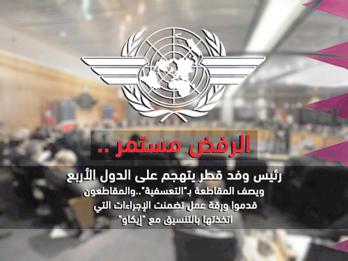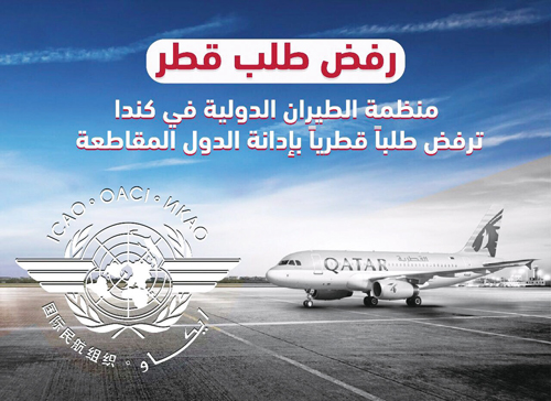 فقد عقد مجلس منظمة الطيران المدني الدولي (الإيكاو) أمس الاثنين جلسة استثنائية بناءً على الشكوى المقدمة من دولة قطر، وفقاً للمادة 54 (ن) من اتفاقية الطيران المدني الدولي (شيكاغو 1944)، التي تمنح الدول الأعضاء الحق ببحث أي مسألة تتعلق بالاتفاقية. وقد شاركت المملكة العربية السعودية بوفد رأسه معالي رئيس الهيئة العامة للطيران المدني الأستاذ عبدالحكيم بن محمد التميمي.