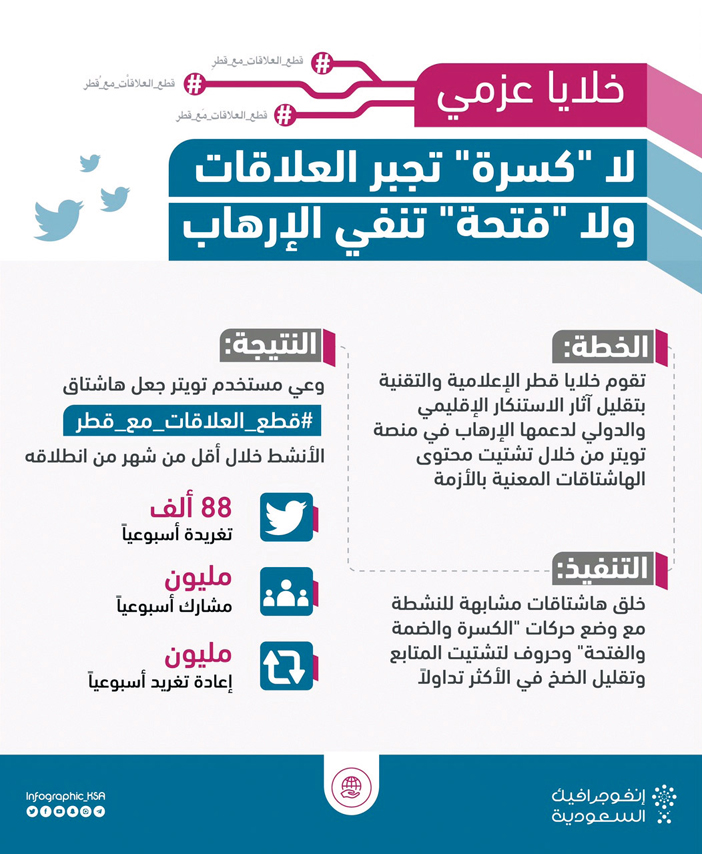 وفي جانب آخر تحاول الخلايا الإعلامية والتقنية في قطر.. تقليل آثار الاستنكار الإقليمي والدولي لدعمها للإرهاب في منصة « تويتر» من خلال تشتيت محتوى «الهاشتاقات» المعنية بالأزمة.. من خلال خلق «هاشتاقات» مشابهة للنشطة مع وضع حركات تشكيل «الكسرة والضمة والفتحة».. وحروف لتشتيت المتابع وتقليل الضخ في الأكثر تداولاً!!.. إلا أن تلك المحاولات تصطدم بوعي مستخدمي «تويتر» ما يُجهض أهداف خلايا «عزمي».