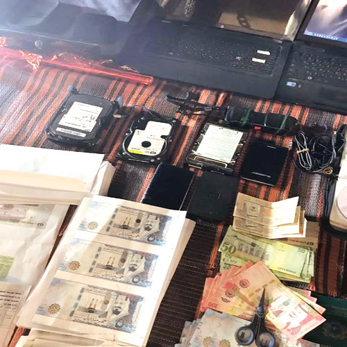 عليه فقد تم العمل على تحليل المعلومات المتاحة وتتبعها من قبل قوة المهمات والواجبات الخاصة بشرطة المنطقة ووضع المتهم تحت مجهر الرصد الأمني على مدار الساعة، ووفقاً لما تم اتخاذه من إجراءات فقد أسفرت الجهود – بفضل من الله تعالى - عن ضبطه والسيطرة عليه في كمين محكم، وعثر بحوزته على أوراق نقدية مزيفة من عدة فئات كما ضبط بحوزته على مجموعة أوراق مزيفة جاهزة للقص والتصريف وعدد (22) إقامة مزيفة وعدد (27) كرت إقامة جاهز للتزييف وعدد (3) بطاقات إقامة نازحين مزيفة وعدد (4) جوازات سفر مزورة، ومعمل متكامل للتزييف والتزوير، وبسماع أقواله أقر بما نسب إليه.