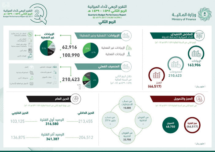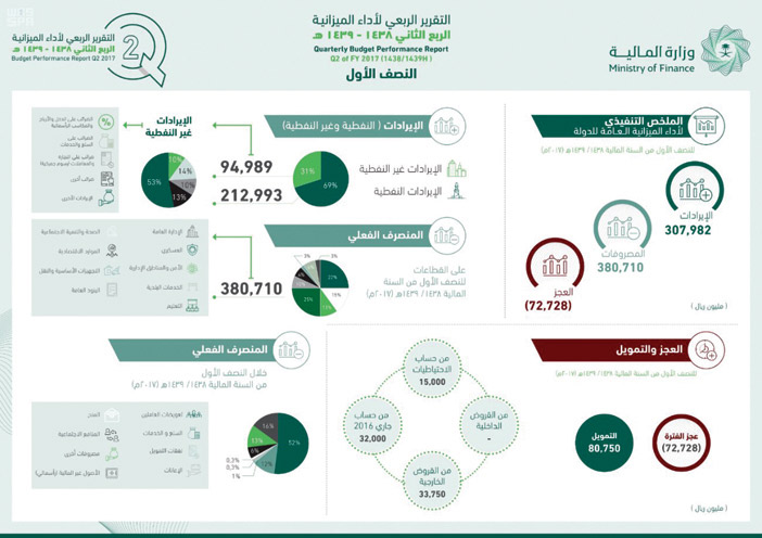 أعلنت وزارة المالية أمس التقرير الربعي لأداء الميزانية العامة للدولة للربع الثاني من السنة المالية 1438/ 1439هـ (2017). وأظهرت المؤشرات المالية لأداء الميزانية العامة للدولة للنصف الأول بلوغ إجمالي الإيرادات 307.982 مليار ريال مسجلة ارتفاعًا بنسبة 29 % مقارنة بالفترة المماثلة من العام الماضي، منها 213 مليار ريال إيرادات نفطية، ونحو 95 مليار ريال إيرادات غير نفطية. كما بلغ إجمالي مصروفات النصف الأول 380.71 مليار ريال مسجلة انخفاضًا بنسبة 2 % مقارنة بالفترة المماثلة من العام الماضي.