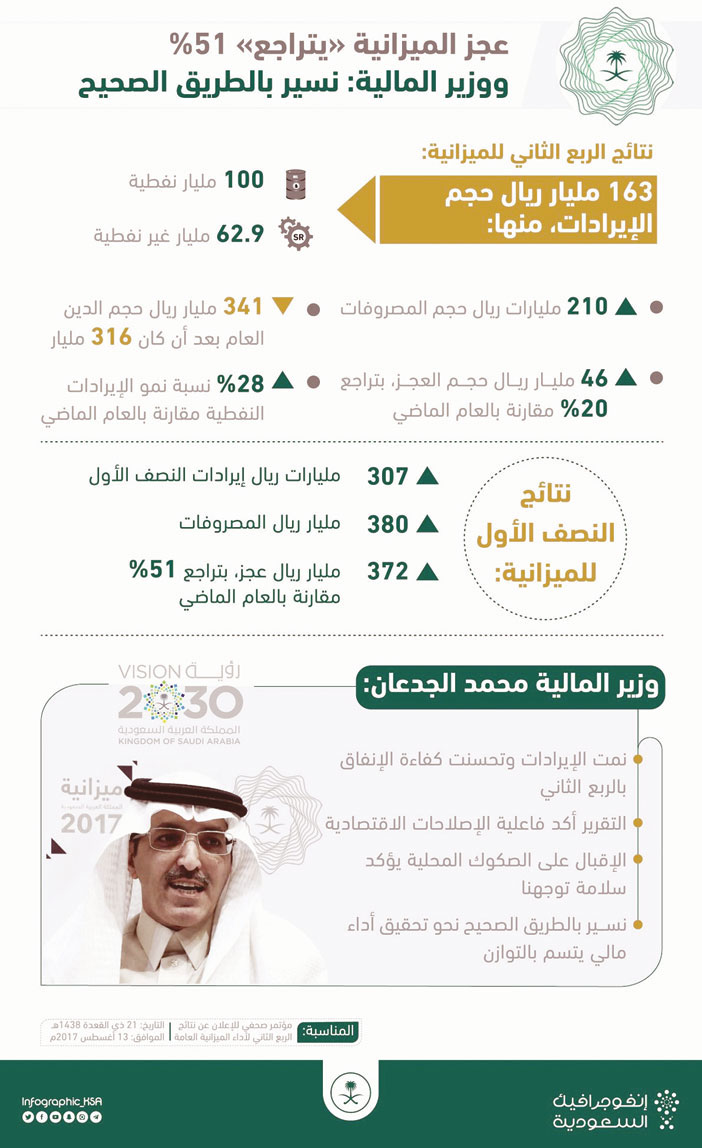 وحول التحديات قال الجدعان "رغم أن التحديات الاقتصادية لا تزال قائمة إلا أننا واثقون بقدرتنا على تحقيق توقعاتنا بشأن العجز المالي لعام 2017. كما يظهر التقرير الربعي الثاني فاعلية الإصلاحات والإجراءات الاقتصادية التي جاءت في برنامج التحول الوطني ضمن رؤية المملكة 2030؛ إذ أسهمت تلك الإصلاحات في إيجاد المزيد من الإيرادات غير النفطية، وتحسين كفاءة الإنفاق، بما يؤدي إلى حالة من التوازن المالي كهدف استراتيجي في المدى المتوسط؛ وبالتالي ينعكس إيجابًا على اقتصاد الوطن ورفاهية المواطنين.