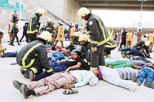 مشيرا إلى أن المديرية العامة للدفاع المدني مستعدة استعداداً كاملاً أسوة بباقي الجهات، والعمل يتم من خلال منظومة متكاملة في كل قطاعات الدولة، والمديرية العامة للدفاع المدني من جانبها استعدت بالآليات والقوى البشرية. من جانبه قال قائد قوات الدفاع المدني بمشعر عرفات العميد عبدالله الحماد: الحمد لله قوات الدفاع المدني قامت بإجراء التدريبات اللازمة في مختلف التخصصات، إضافة إلى تمارين لكل وحدة على حدة، وبعد اكتمال استعدادات الدفاع المدني تم التنسيق مع الجهات ذات العلاقة من أجل تمرين فرضي كبير تشارك فيه جميع الجهات. وقالت قيادة قوات الدفاع المدني في الحج إنه تم خلال تنفيذ هذه الفرضية تم تطبيق خطة الإطفاء والإنقاذ بنجاح من خلال التمركز الصحيح وإعطاء مجال للآليات المساندة، وتقديم أعمال الإنقاذ على ضوء حجم الحدث والقيام بتحديد مناطق الإسناد الآلي والبشري والقيام بكافة ما يتطلبه الحدث من إجراءات في حينه وتوزيع الأدوار والمهام على المشاركين في الحادث، حيث تم عمل حاجز أمني حول منطقة الحدث، مع نقل المصابين والمتوفين إلى منطقة الإخلاء الطبي للقيام بعملية الفرز كما تطبيق خطة الإيواء لعدد (800) حاج تم إخلاؤهم من المخيمات.
