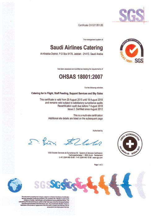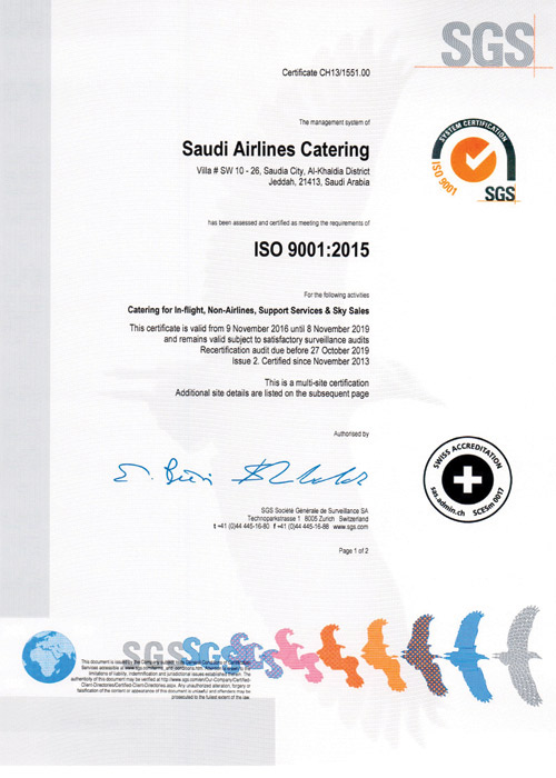 وتقديراً لما تطبقه من معايير عالمية ومقاييس مُتقدمة في المنتج الغذائي والخدمات إضافة إلى التطوير المستمر لأدائها الإداري والاقتصادي بمنظور علمي، حصلت شركة الخطوط السعودية للتموين على شهادات تقدير وجوائز محلية وعالمية عديدة من بينها جائزة جامعة الفيصل لأفضل ممارسات حوكمة الشركات في المملكة من بين 172 شركة مساهمة مدرجة في السوق السعودية، الأمر الذي يعكس كفاءة النظام الداخلي للشركة وتطبيقها لممارسات الحوكمة السليمة وتنويع نشاطها الاقتصادي بما يتوافق ورؤية المملكة 2030، يضاف إلى ذلك جائزة الاتحاد الدولي لسلامة، وجودة خدمات التموين للرحلات الجوية QSAI لعام 2016م، إلى جانب الجوائز الذهبية من منظمة (مدينا) المتخصصة في مراقبة شركات التموين الجوي حول العالم وذلك للأعوام من 2009م وحتى 2013م، فضلاً عن شهادة مجلس هيئة الأطعمة الحلال (حلال) وشهادة نظام تحليل المخاطر وتحديد نقاط التحكم الحرجة HACCP إلى جانب الشهادات الخاصة بأنظمة إدارة الجودة (أيزو 9001- 2008) وأنظمة إدارة السلامة والصحة المهنية (18001 - 2007) ونظام إدارة سلامة الغذاء (أيزو 2200 - 2005) وغير ذلك من الجوائز وشهادات التقدير التي تؤكد حرص الشركة على تطوير إمكاناتها وأدائها ومنتجاتها بهدف تعزيز موقعها الريادي كصرح اقتصادي من صروح هذا الوطن المعطاء.