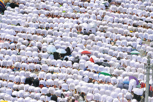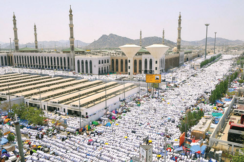توافدت جموع غفيرة من حجاج بيت الله الحرام منذ وقت مبكر إلى مسجد نمرة في مشعر عرفات أمس لأداء صلاتي الظهر والعصر جمعاً وقصراً؛ اقتداء بسنة النبي المصطفى محمد - - والاستماع لخطبة عرفة. وامتلأت جنبات المسجد الذي تبلغ مساحته (110) آلاف متر مربع والساحات المحيطة به التي تبلغ مساحتها ثمانية آلاف متر مربع بضيوف الرحمن.