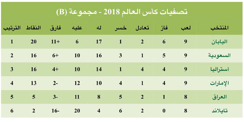 وتتنافس استراليا والسعودية على بطاقة التأهل الثانية للمجموعة حيث يقتسمان المركز الثاني برصيد 16 نقطة بفارق 3 نقاط عن الإمارات صاحبة المركز الرابع , وسيتأهل صاحبا المركزين الأول والثاني من المجموعة مباشرة للمونديال، فيما يخوض صاحب المركز الثالث دورا فاصلا مع صاحب المركز الثالث في المجموعة الأخرى على أن يخوض الفائز منهما مباراة فاصلة مع صاحب المركز الرابع في تصفيات كونكاكاف (أمريكا الشمالية والوسطى والكاريبي).