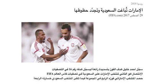 وعنون موقع «الفيفا» في تقريره عن المباراة «الإمارات تباغت السعودية وتجدد حظوظها» وكتب حساب الموقع في «تويتر»: مبخوت وخليل يصنعان الفارق..